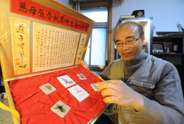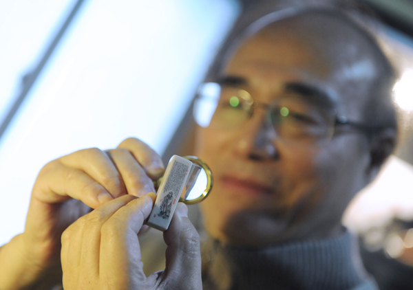 王天明,今年71岁,出生于上海,从小就喜欢写字、画画,参加工作后也没有放弃,一个偶然的机会他接触到微雕艺术后,便一发不可收拾。王天明不仅能在玉石、壶、米粒等材料上雕刻,还能在头发丝上雕刻。他曾四处收集了100根青壮年的白发,把头发处理成平面,再用特殊的技法雕刻,白发上11个黑字“和平统一 天下为公 天明刻”,末尾还有印章,要用100倍的放大镜才能看清,最终只雕刻成功了2根。