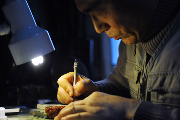 王天明的“济南微雕”技艺有三绝:微书、微画、微型工艺。王天明更多的是凭着自己的感觉,用不断练习获得的手感来进行创作,“微雕其实就是中国传统文化的集成,既要有书法绘画的功底,还要有足够的传统文化素养。当看到粉末的时候,证明刻刀已经刻上去了,凭着感觉雕刻,最后去掉粉末,作品就完成了。”王天明说道。