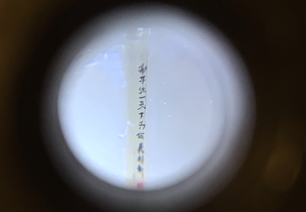 在100倍放大镜下可看到白发丝上刻有“和平统一 天下为公 天明刻”字样