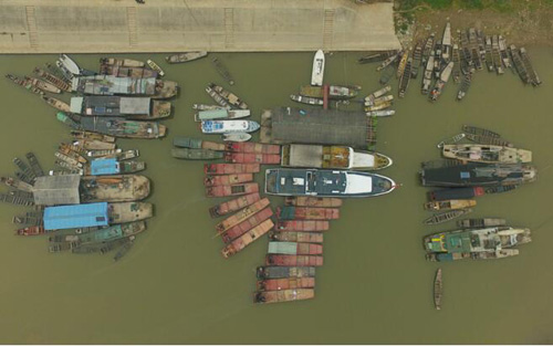 △在湖南常德汉寿县蒋家嘴镇,待回收的铁渔船停靠在洞庭湖边(2019年12月17日摄,无人机照片)。2020年1月1日零时起,长江流域332个自然保护区和水产种质资源保护区全面禁止生产性捕捞。长江流域各地重点水域也将相继进入为期10年的常年禁捕期。
