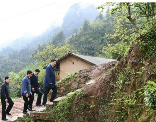 △2019年4月15日下午,在重庆市石柱土家族自治县中益乡华溪村,习近平踏着湿滑的石阶登上陡坡,前往贫困户谭登周家看望。
