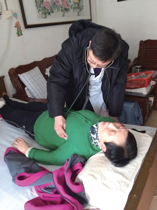 前段时间,李国芳因脑梗入院,如今身体已恢复得很好。而每次上门,为李国芳进行查体都是必不可少的。科室主任张守林为李国芳听诊,护士胡莹为她进行血压测量等生命体征的监测……
