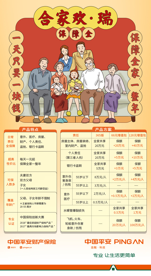 2020年,平安产险山东分公司特推出合家欢·瑞,业内首创家庭单,专为家庭设计,守护全家人的平安,今年特免费增加传染病身故保险(含新冠肺炎),为您和您的家人守护健康和财产;作为十三届中国保险创新大奖获得者,合家欢始终致力于做最好的综合家庭保障保险,20年产品全面升级,结合目前 “新冠”疫情形势,力争为全家三代8口人带来更加全方位的保障;
