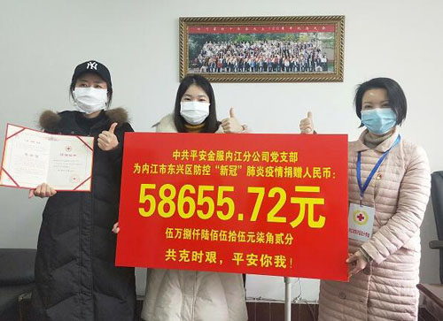 疫情发生以来,平安金服一直在尽心尽力,为防控贡献力量。2月5日,金服内江分公司率先发起捐款倡议,一天内募集5.8万元爱心捐款,捐赠至内江市东兴区红十字会,专项用于新冠肺炎疫情防控。