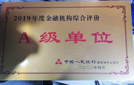 2020年3月,根据《山东省金融机构综合评价管理办法》规定,中国人民银行泰安市中心支行组织对全市金融机构进行了综合评价。经金融组织领导小组综合评议,山东平安产险泰安中心支公司在此次评比活动中成绩突出,荣获了泰安市保险业金融机构A级单位称号。