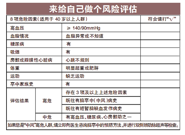 “预防脑卒中具体来说,日常生活应注意清淡饮食,适度增强体育锻炼,戒烟酒、避免久坐等,防止过度劳累,注意天气变化,及时增减衣物,保持情绪稳定,定期进行健康体检、发现问题早防早治等。”徐春晓表示,高血压患者应注意控制高血压;高血脂症患者应注意控制血脂;糖尿病患者应积极控制血糖;房颤或有其他心脏疾病患者应控制心脏病相关危险因素。