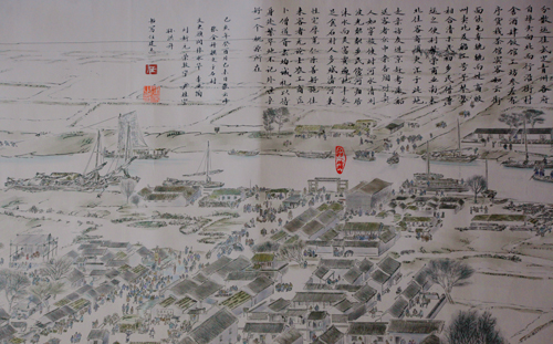 小清河是山东省内唯一一条具有水陆联运、河海联运、农田灌溉、水产养殖等多种功能的河流,发源于济南城区,东流入海。据杨勇介绍,这幅《小清河东流图》画的是1890年至1910年这段时期的小清河,按照比例还原两岸五公里以内的各种古迹、人文景观、村庄、农田,中间穿插着各种人物,农民、脚夫等,在每处古迹、建筑、山川等处,还都钤有一方随形红色印章,标出其名称,成为了画面中一个独特的点缀,让现代的济南市民感受到了100多年前的小清河旧韵。