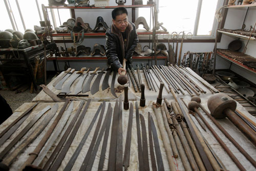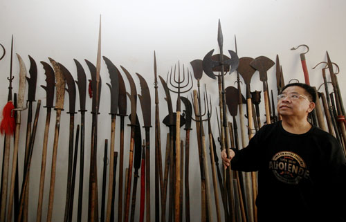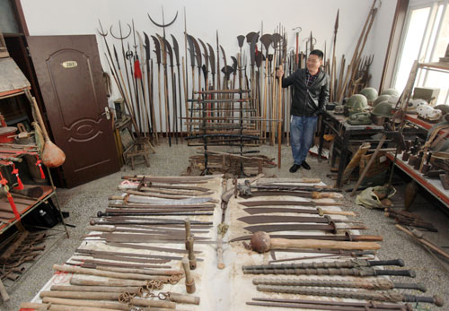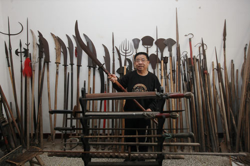 “我之前经营一家熟食店,一次和朋友偶然聊天才认识并走上了古玩收藏之路”,马方荣告诉记者,“我尤其喜欢古代冷兵器的收藏,这是我们传统文化的载体,是后人了解历史的绝佳教材。”自己喜欢,家里人也支持,马方荣便放开膀子玩起了收藏,在一间20多平的房间里,摆满了从宋代到抗战时期的各种兵器,除了有历史感,不少兵器还很贵重。长枪、长矛、大刀、剑、锏、鞭、锤……各式各样,每一件兵器马方荣都能讲出它的历史,“去年有个朋友想用60万买下我这一屋子的兵器,我没舍得卖”。平时还会有不少好友前来“淘宝”,每次老马都会泡上一壶茶,选上两件称手的兵器与好友分享、切磋。