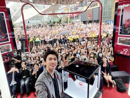 INTO1林墨在现场为粉丝们示范小红蝎精华的使用手法,和粉丝大玩下颌线自拍,给直播间粉丝派发福利,为线上线下粉丝大派新的“三千万”,把发布会做成了一场INTO1林墨和小红蝎精华的大型宠粉现场。