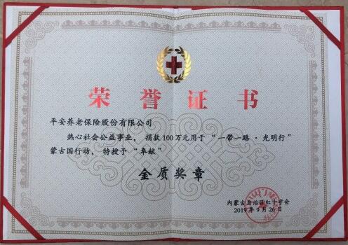 图:平安养老险荣获“奉献”金质奖章和荣誉证书