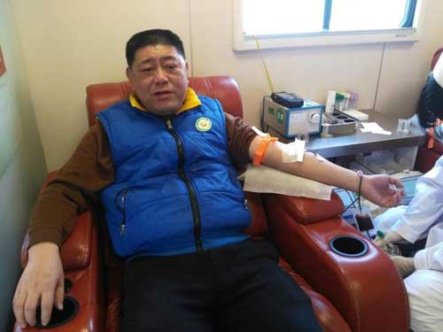 今年大年初一身穿志愿者服的金孟民在献血