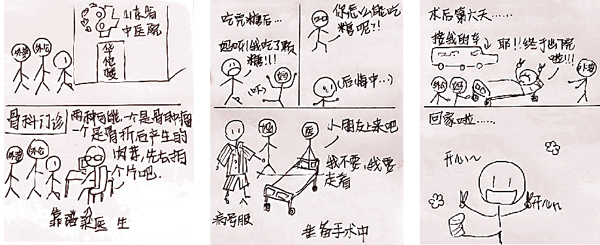 《看病记》中,米豆以一种充满童趣的笔触将求医路上的点点滴滴轻松、欢快地描绘下来。米豆妈妈张女士表示,孩子很喜欢画画,平时就有用画画的方式做笔记、写日记和创编搞笑小漫画的习惯。这次用绘画的形式将就医过程记录下来,不仅表达了对梁延琛医生的感激,对于孩子而言,也是一个有意义并且十分珍贵的回忆。