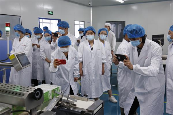 24日下午,采访团成员走进明仁福瑞达制剂生产车间。流水化的自动作业机器上,各种药品经过前处理、提取及制剂之后被打包成盒,单项冠军产品“颈痛颗粒”就是从这里走向全国的医院以及药店。