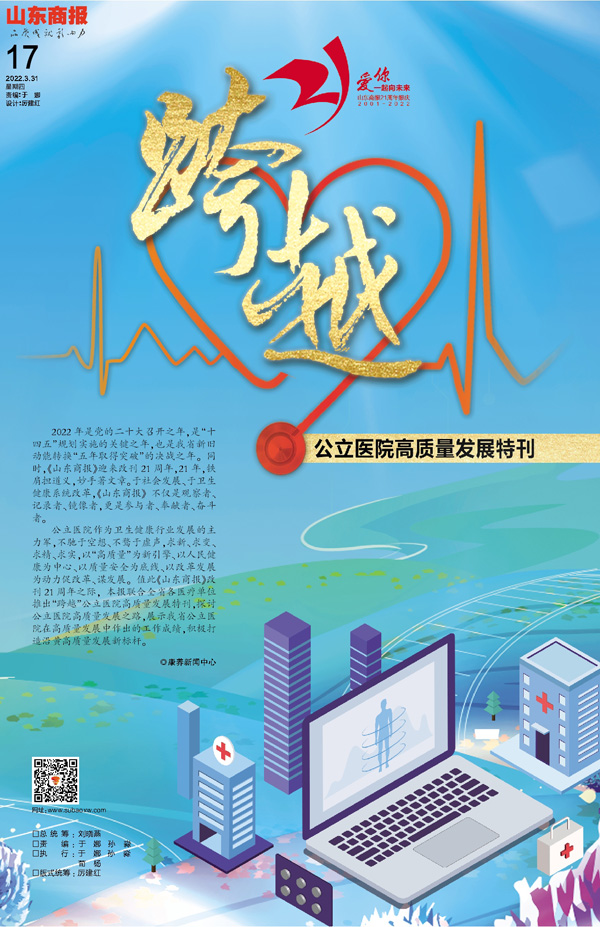 公立医院作为卫生健康行业发展的主力军,不驰于空想、不骛于虚声,求新、求变、求精、求实,以“高质量”为新引擎、以人民健康为中心、以质量安全为底线、以改革发展为动力促改革、谋发展。值此《山东商报》改刊21周年之际,本报联合全省各医疗单位推出“跨越”公立医院高质量发展特刊,探讨公立医院高质量发展之路,展示我省公立医院在高质量发展中作出的工作成绩,积极打造沿黄高质量发展新标杆。