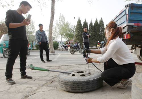 张霞是济南人,12年前做洗车工作时结识了现在的老公,意识到轮胎行业的广阔市场后,夫妻俩选择了这个行业并持续至今。二环北路上经常有大卡车经过,来此修补大轮胎的司机络绎不绝,加之张霞的老公长时间负责外出送货,店里所有的活几乎全由张霞包揽。渐渐的,她的力气越来越大,干活也越来越麻利,让很多男士都自愧不如。每次修车,张霞都会要求顾客为其拿着手机做直播,这样的话她就可以工作、直播两不误。