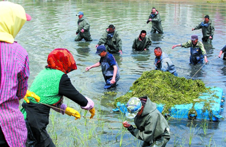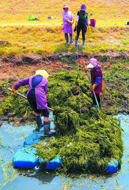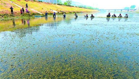 昨日在省城腊山河分洪道内,十几名穿着连体防水服的工作人员正清理河道里的“菹草”。目前,腊山河分洪道几乎全被这种菹草“占领”,远远看去如同草原一般。据了解,这种菹草又名虾藻、卖黄草,是多年生沉水草本植物,繁殖迅速,一般4-5月开花结果,6月中旬开始衰败腐烂。由于近期省城气温回升,该河道内的菹草更是泛滥成灾。