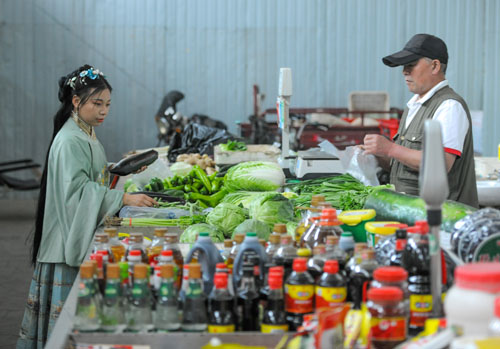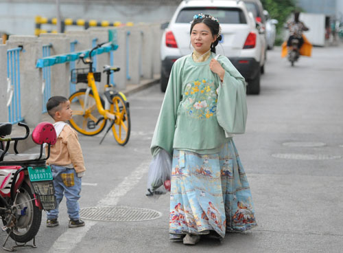 身着汉服的舒秋红走在街上吸引了小朋友的目光