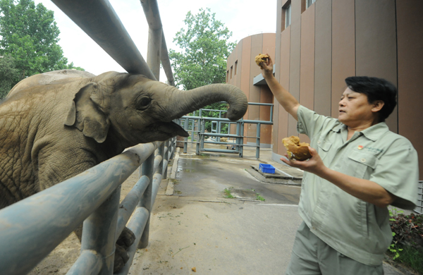 给小象喂食同时进行行为训练