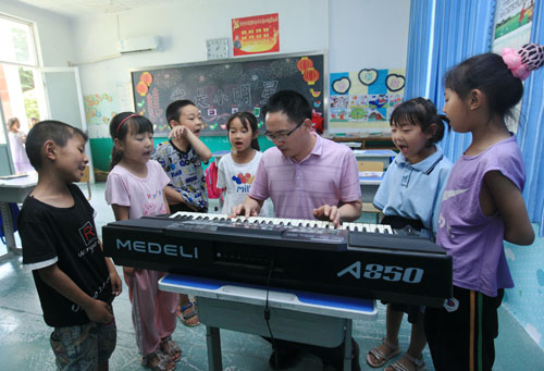 音乐课上,在张继峰的伴奏下,孩子们唱起了《粉刷匠》