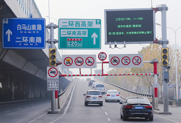 济南限行道路上的指示牌已显示相关提示内容 记者 张舒 通讯员 解旺 摄