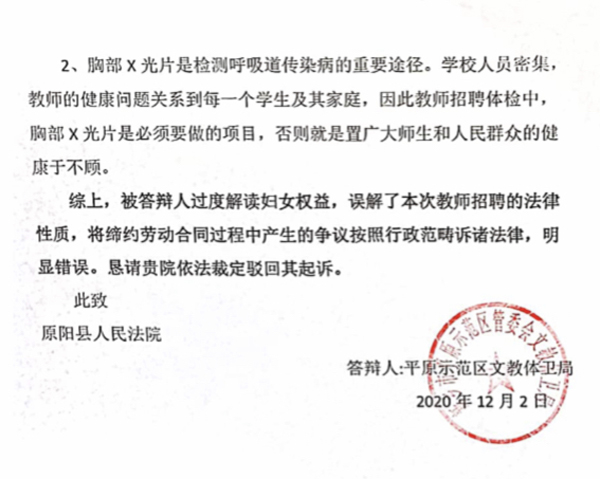 关于教体局在答辩中提到的第三条答辩意见,钟兰安表示,许女士因怀孕未做胸透,被当地以体检项目不全为由,拒绝录用。此举,侵害了许女士的平等就业权。