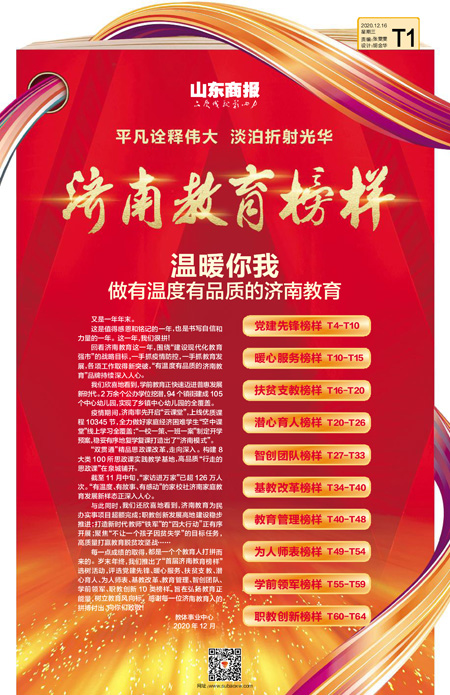 每一点成绩的取得,都是一个个教育人打拼而来的。岁末年终,我们推出了“首届济南教育榜样”选树活动,评选党建先锋、暖心服务、扶贫支教、潜心育人、为人师表、基教改革、教育管理、智创团队、学前领军、职教创新10类榜样,旨在弘扬教育正能量,树立教育风向标。感谢每一位济南教育人的拼搏付出,向你们致敬!