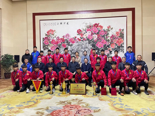 菏泽市领导与曹州武校“功夫足球队”合影留念(曹州武校供图)