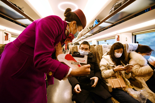 昨日,在成渝高铁成都东至沙坪坝G8609次列车上,列车长李静向乘客讲解乘坐“静音车厢”的注意事项。新华社发