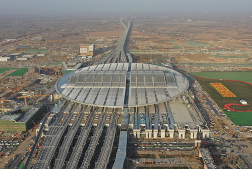 雄安站是京雄城际铁路规模最大的新建车站,也是雄安新区开工建设的第一个重大基础设施项目。从空中俯瞰,雄安站巨大的椭圆形屋顶形似荷叶上的一滴露珠。雄安站建筑面积47.52万平方米,站场规模13台23线,采用站城一体化设计,有效融入城市肌体。