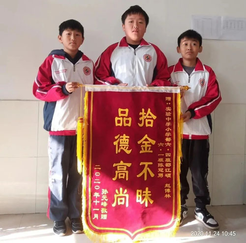 11月24日上午,失主来到潍坊寒亭区实验中学送上了锦旗,对学校能够培养出这么优秀的学生表示感谢。“八万元数目不小,陈冠南、赵博林、邵江硕三位同学,面对金钱毫不动心,这高尚的品质已远远超越金钱本身的价值。在学校崇德、尚能、博学、笃行的校训感召下,拾金不昧这一优良传统已