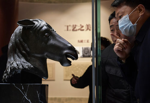 昨日,“圆明园马首铜像划拨入藏仪式”在北京圆明园正觉寺举行,历经160年漂泊的圆明园马首铜像回归“故里”。图为参观者在展厅内观看马首铜像。新华社发