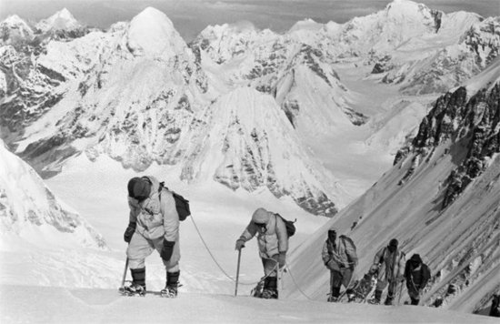 1960年5月,中国登山队队员在海拔7150米的冰雪坡上行进。 新华社发