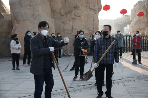 东营文旅集团利用应对疫情闭园时间,在严格执行防疫规定的前提下,对动物园新规划设计的景观进行全面建设,植树造景,共盼春来。图为董事长杨树行(左)安排植树活动。