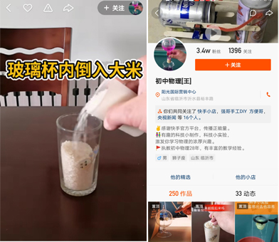 王老师的240多个快手视频中,涵盖了力学、热学、光学、磁力学等物理知识,与纯书本概念、公式讲解不同的是,它们以立体的形式,用绚烂的颜色和神奇的变化刺激着人们的中枢神经,激发大家对物理学习的兴趣。