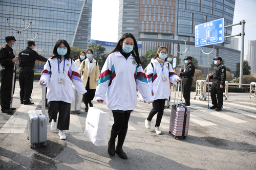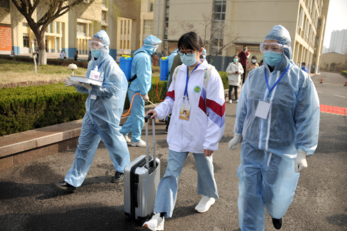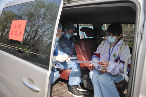 发现体温异常的学生,医护人员带到临时隔离点进行医护隔离