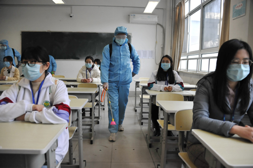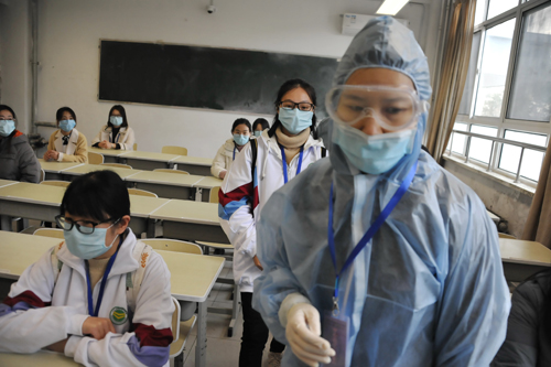 所在班级学生全部原地不动,防疫人员对教室进行消毒