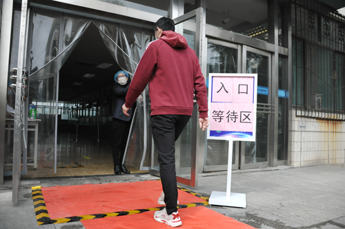 副校长王群告诉记者,一旦允许返校后,每天需要学生拿着在家里体温测量合格的纸条到校,然后进入入校体温检测通道。大门口的A型架上,写着“请同学们沿跑道线间隔一米排队测温”,在值勤教师的引导下,学生将在南跑道沿6条跑道线站成6列纵队,在距离测温帐篷5米处,变成两列纵队有序进入测温帐篷检测体温。这一关过了之后,学生进入各自班级,而班主任老师会在教室门口,等着为每位学生测温,合格后,学生才能进入教室。