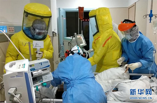 2月15日,广东省对口支援湖北荆州医疗队队员、南方医科大学南方医院的医护人员在荆州救治患者。新华社发