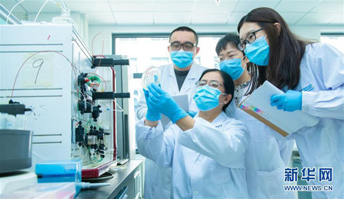 3月20日,中国科学院微生物研究所研究员严景华与团队的学生们讨论实验结果。新华社发(王强 摄)