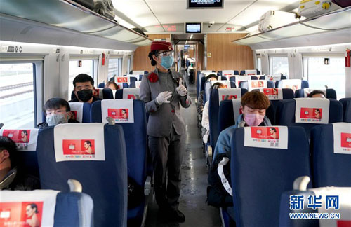 2月22日,乘务员在G3105次专列上向返岗务工人员讲解防疫注意事项。当日,来自河南安阳、新乡、周口、平顶山等地的700多名务工人员搭乘G3105次定制专列去往浙江杭州返岗复工。新华社记者 李安 摄