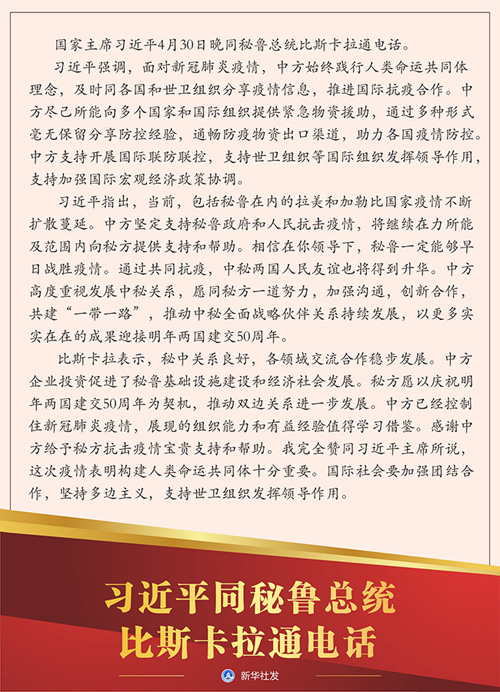 新华社北京4月30日电 国家主席习近平4月30日晚同秘鲁总统比斯卡拉通电话。