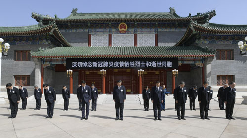 中南海怀仁堂前气氛庄严肃穆,门楣上悬挂着黑底白字横幅“深切悼念新冠肺炎疫情牺牲烈士和逝世同胞”。习近平等佩戴白花,来到这里,神情凝重面向国旗肃立。