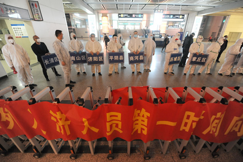 之前,据济南西站管委会主任马中鹏介绍,自7日接到通知后,他们马上通过铁路、公安、政府等渠道,掌握了武汉来济旅客的身份信息。“最早的一列武汉来济列车是下午2点半到,到时现在的出站通道将作为武汉旅客的专用通道,我们会再开一条通道作为普通旅客出站使用,以作区分。同时,考虑到有旅客集中到达的情况,原有的2处登记点升级到了4处。”他介绍,出站处会有专门的指示牌,每位出站旅客也都会经过身份查验,“由于已经对身份信息有了掌握,所以即便旅客走错了通道,我们工作人员也会发现,以做到100%登记不漏一人。”