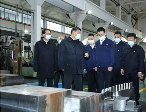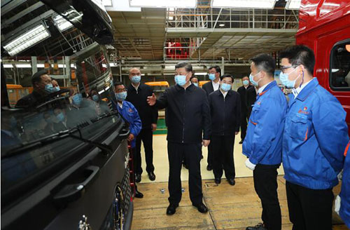 ▲2020年4月22日,习近平在陕西汽车控股集团有限公司总装车间察看生产线,了解产品研发、生产、销售和复工复产情况。