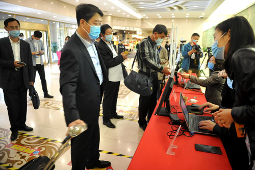 昨日在济南市舜耕山庄,参加济南市政协十四届四次会议的政协委员向大会报到 山东商报·速豹新闻记者 王晓峰摄