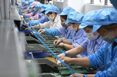 △工人在深圳光明区普联技术有限公司出口产品生产车间作业。3月份,工业产出规模接近去年同期水平;全国货运周转量和客运周转量同比增速比上月分别加快9.9和14.3个百分点;全国城镇调查失业率环比下降0.3个百分点至5.9%。