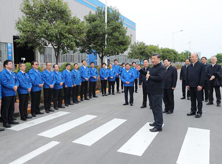 △2020年3月29日至4月1日,中共中央总书记、国家主席、中央军委主席习近平在浙江考察。这是3月29日,习近平在宁波舟山港穿山港区,同港口职工代表亲切交流。