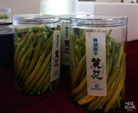 △以黄花为原材料制作的黄花饼、黄花酱、真空冻干黄花。(总台央视记者张晓鹏拍摄)