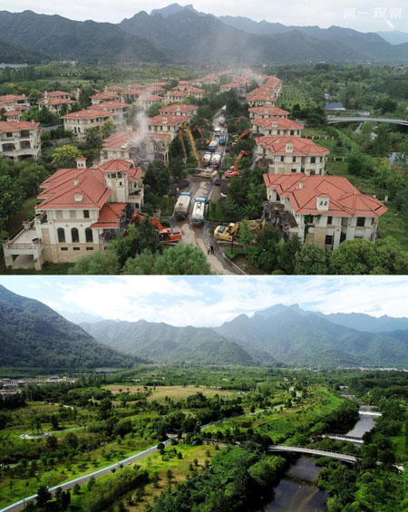 ↑拼版照片:上图为2018年9月,西安市长安区对辖区内东大街道的秦岭违建别墅“群贤别业”进行拆除(新华社记者 邵瑞 摄);下图为2019年7月拍摄的秦岭违建别墅“群贤别业”拆除后建设的秦岭和谐森林公园(新华社记者 刘潇 摄)。