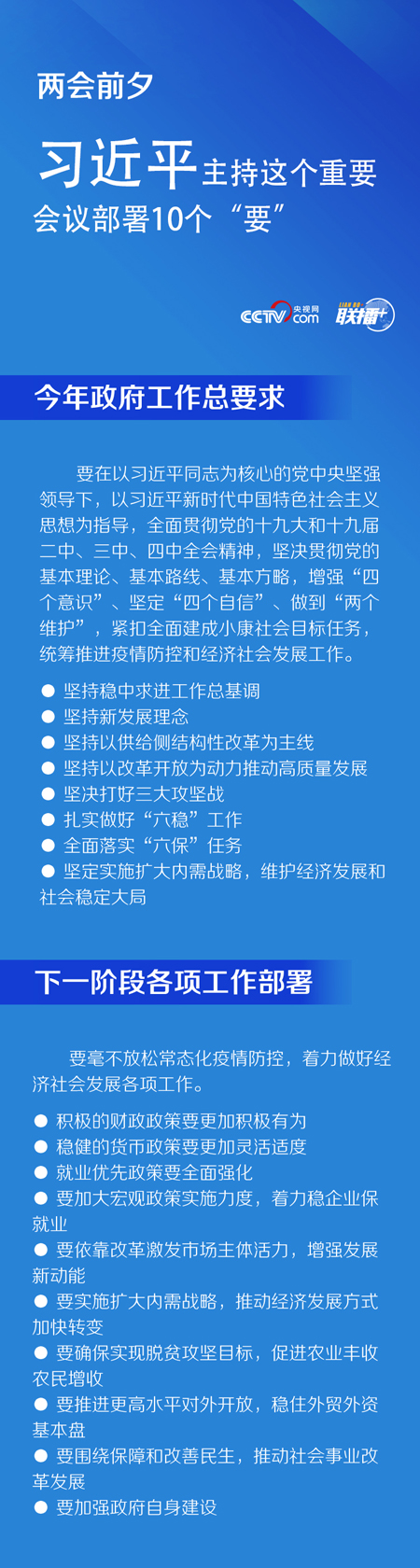 会议强调,当前全球疫情和世界经济形势仍然严峻复杂,我国发展面临的挑战前所未有。做好今年政府工作,要在以习近平同志为核心的党中央坚强领导下,以习近平新时代中国特色社会主义思想为指导,全面贯彻党的十九大和十九届二中、三中、四中全会精神,坚决贯彻党的基本理论、基本路线、基本方略,增强“四个意识”、坚定“四个自信”、做到“两个维护”,紧扣全面建成小康社会目标任务,统筹推进疫情防控和经济社会发展工作,在常态化疫情防控前提下,坚持稳中求进工作总基调,坚持新发展理念,坚持以供给侧结构性改革为主线,坚持以改革开放为动力推动高质量发展,坚决打好三大攻坚战,扎实做好“六稳”工作,全面落实“六保”任务,坚定实施扩大内需战略,维护经济发展和社会稳定大局,确保完成决战决胜脱贫攻坚目标任务,全面建成小康社会。